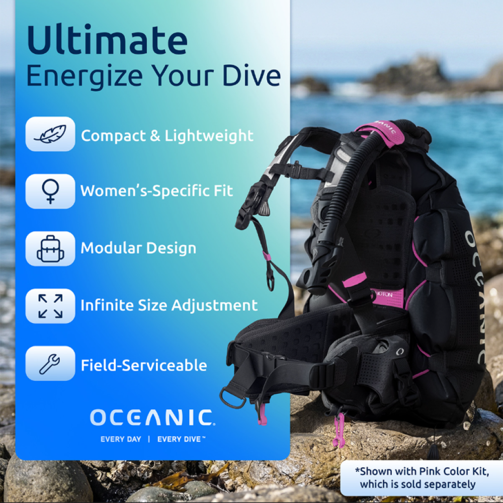 The Oceanic Photon Air women’s BCD is a travel-ready back-inflation BCD built to keep you streamlined. It’s compact, light, and designed with innovative materials to both shed moisture quickly and deter UV-damage. With customization in mind, the Photon Air modular frame allows you to easily add accessories, readjust straps as your diving evolves, or even add color kits for a personal touch. If you want a women’s travel BCD that’s easy to handle both above and below the waterline, and that helps your trim, the Oceanic Photon Air is a smart match. You get stable back-inflation control, ergonomic female-first comfort, and a quick-dry harness designed to drain and dry faster. Customize it with Photon add-ons as your diving grows.