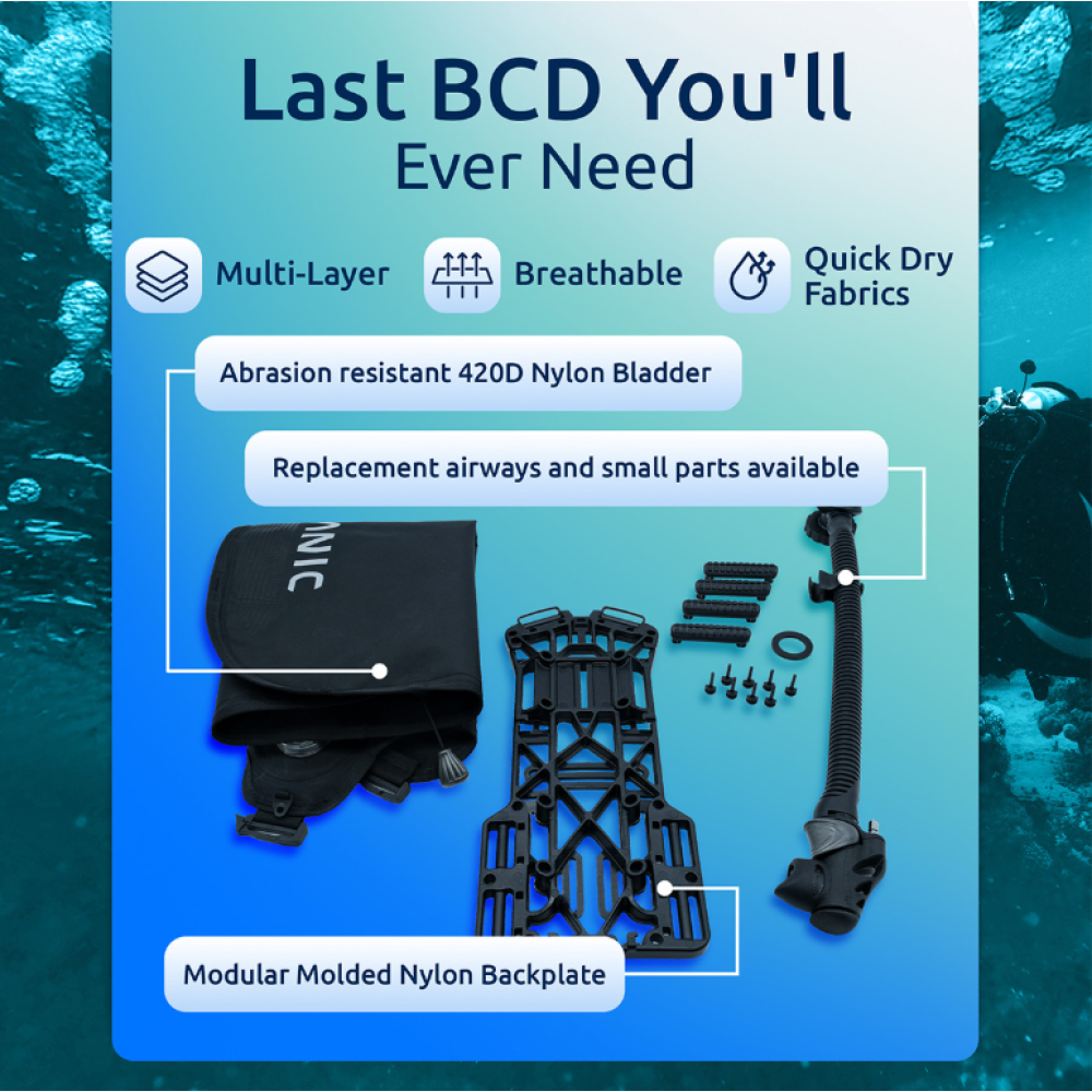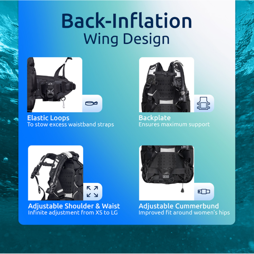 Photon’s compact back-inflation wing and lightweight backplate design makes packing a breeze, reduces drag underwater and effortlessly improves horizontal trim underwater.